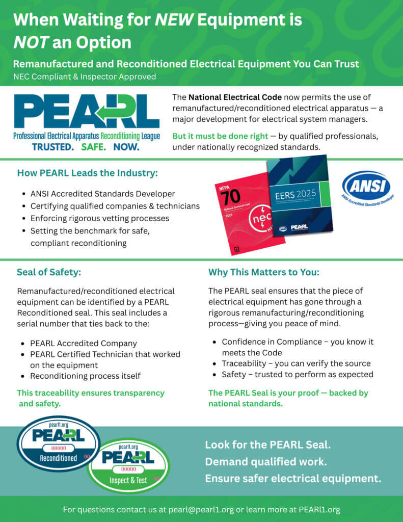 Remanufactured and reconditioned electrical equipment you can trust. NEC compliant & inspector approved. Look for the PEARL Seal, demand qualified work, and ensure safer electrical equipment.